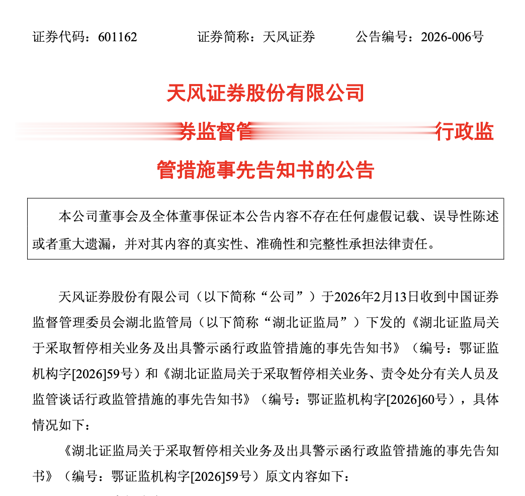 2026年2月13日收盘后,天风证券(601162)密集发布多份公告,披露了来自中国证监会及其派出机构的系列处罚决定。这不仅是简单的“一日领多罚”,更是一次涉及历史旧账、业务违规乃至新发立案的全方位合规性拷问。从拟对前高管采取终身市场禁入的“顶格处罚”,到核心业务被暂停两年的“惨痛代价”,天风证券正在为其过去数年间在公司治理与内控合规上的失守付出沉重代价。