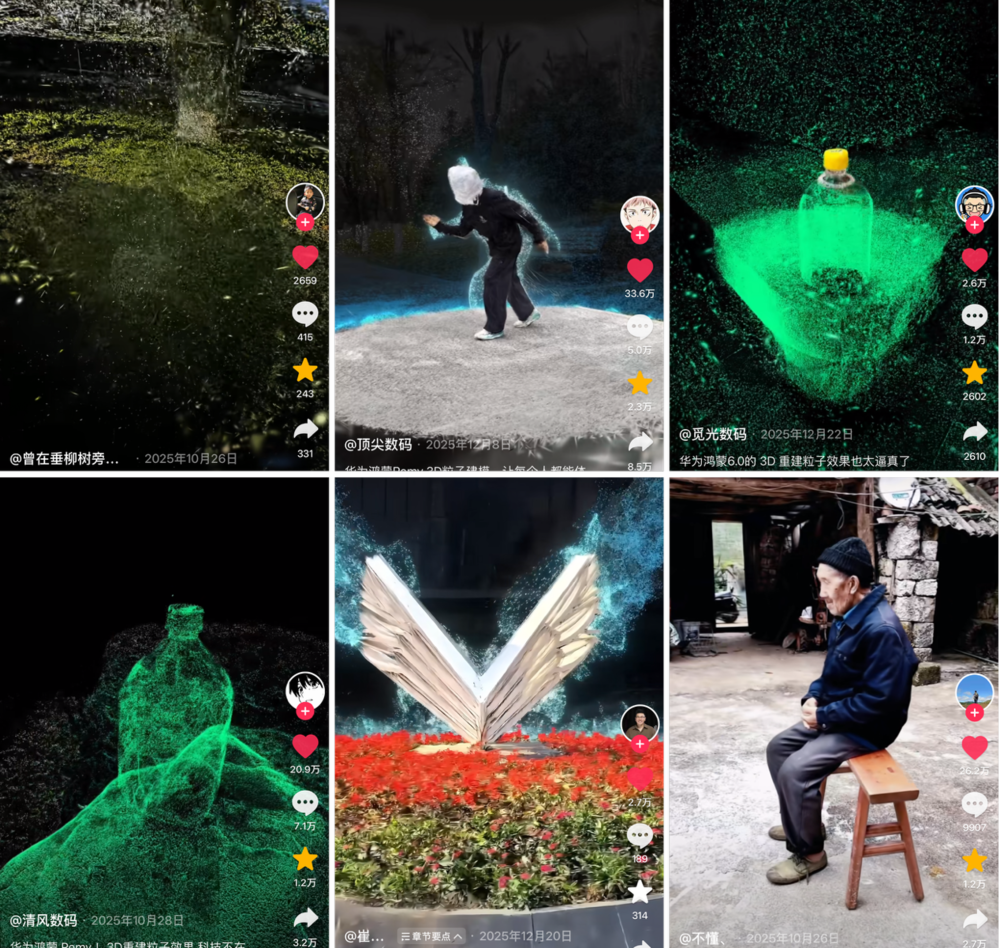 这和我们今天做3D内容的困境一模一样——新的内容形态,现有传统2D媒体根本接不住。所以Insta360推出了一个“小星球特效”的功能,才算真正爆火起来。基于这个思路,我们就想3D内容能不能也这么做?所以在Remy里做了实景特效视频。用户可以任意选择一个模板,把自己扫描的3D内容,生成对应的特效视频。这种特效视频足够新奇、足够帅,而且能直接适配所有2D社交平台,所以每个用户拍完之后都会主动发到抖音、朋友圈。