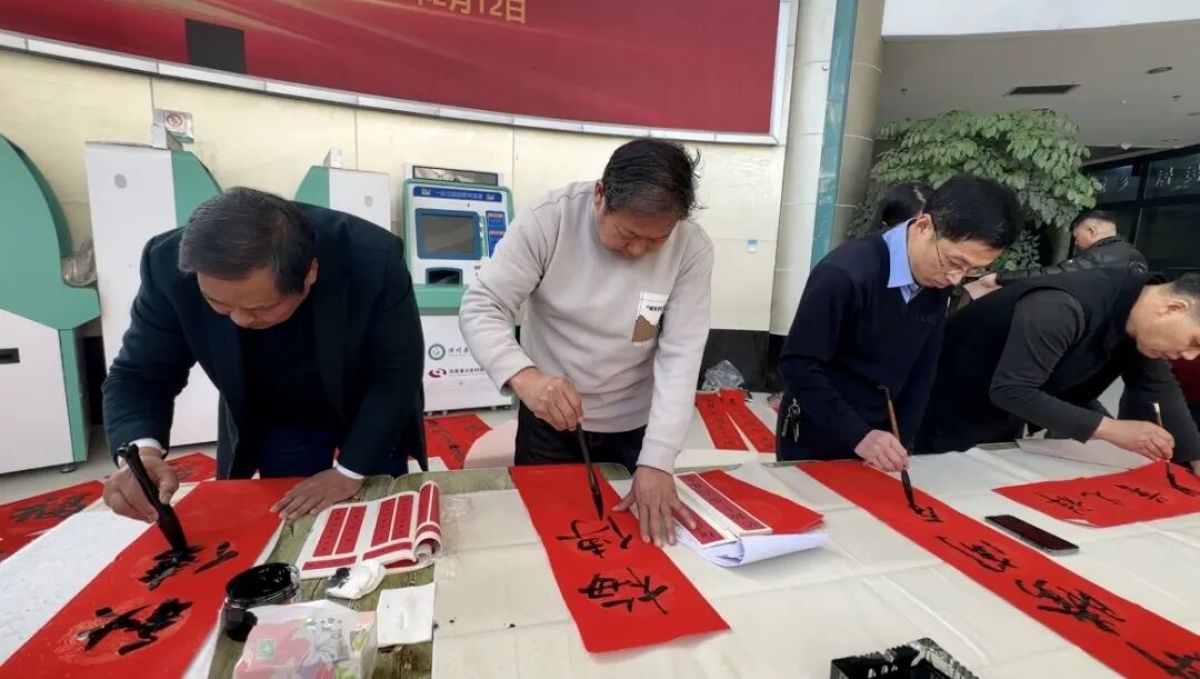 活动现场,红纸铺展,墨香四溢。县书法家协会的书法家们挥毫泼墨、笔走龙蛇,将新春祝福凝于笔端,精心书写一副副寓意吉祥的春联与一个个饱满喜庆的“福”字。楷、行、隶等多种字体各显神韵,内容既有平安喜乐、阖家安康的美好祝愿,也有致敬医者仁心、守护群众健康的真挚礼赞,墨香与年味相融,暖意与温情交织。