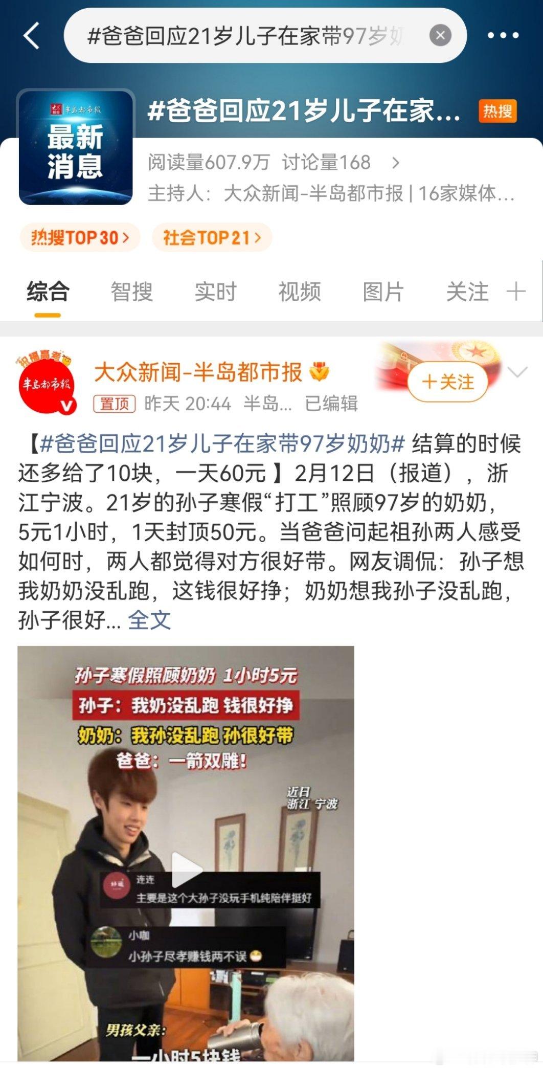 21岁成年人陪伴至亲还需金钱驱动,暴露的是,内心的荒芜。公众盲目喝彩,折射出对亲情功利化的纵容;媒体炒作此类“温情故事”,实则是用廉价感动掩盖社会价值观的扭曲。当孝心沦为明码标价的交易,所谓的正能量不过是娱乐至死时代的精神麻醉剂。
