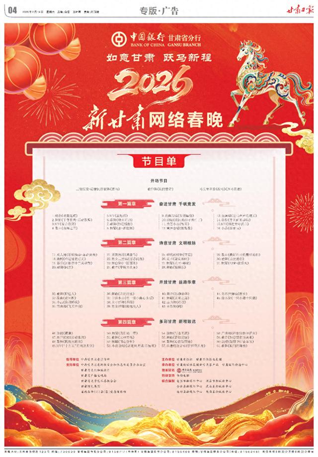本届网络春晚努力打造一场既有地域深度,又有时代温度的文化盛宴,60余个精心评审的节目,涵盖歌曲、戏曲、器乐、舞蹈、小品、非遗展示等,彰显时代精神、具有甘肃特色。