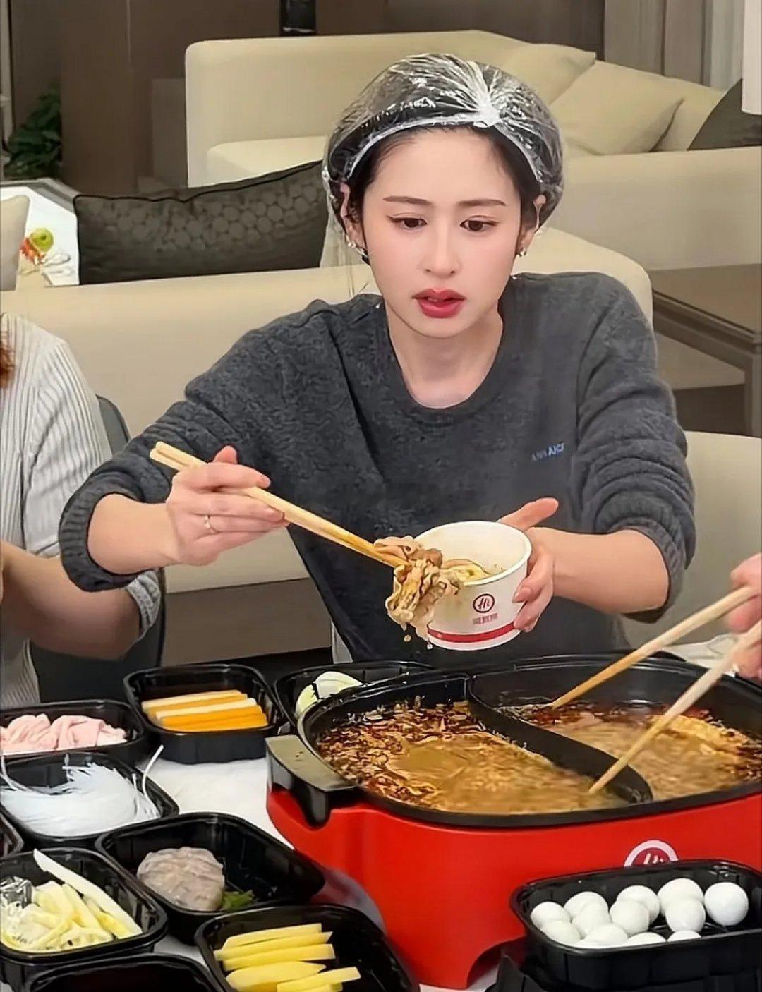 颖儿请客邀请团队工作人员吃火锅,怕头发上面沾到火锅味,还特意戴了一层头套,女明星