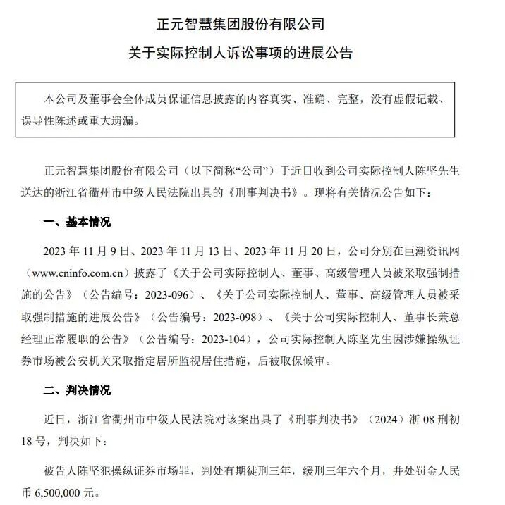 正元智慧13日晚间公告,公司实际控制人陈坚犯操纵证券市场罪,被判处有期徒刑三年,缓刑三年六个月。