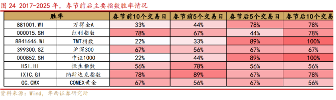 从历史经验来看,华西证券表示,复盘2017—2025年,万得全A春节后10个交易日平均涨幅为3.3%,春节前10个交易日平均跌幅为1.3%,多数年份节后表现优于节前。从胜率角度看,近九年万得全A春节后5个交易日、春节后10个交易日胜率分别为78%、78%,相较春节前胜率有明显抬升。
