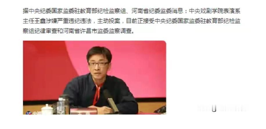 2026年2月这几天,中戏可谓是“地震”不断。先是2月12日原主任陈钢投案,接着13日现任表演系主任王鑫也主动投案接受审查调查,再加上2025年12月被查的院长郝戎,这所艺术名校多名高层短时间内接连落马。王鑫就是《风筝》里中统头子田湖的扮演者,他演技扎实,和柳云龙的对手戏很精彩,还出演过《无问西东》等剧。他还是中戏教授、博导,教出了易烊千玺等明星学生。网友调侃六哥当年打轻了。如今他因违纪违法自毁前程,演艺圈整治腐败也该好好推进了,不知后续还有多少人会落网。