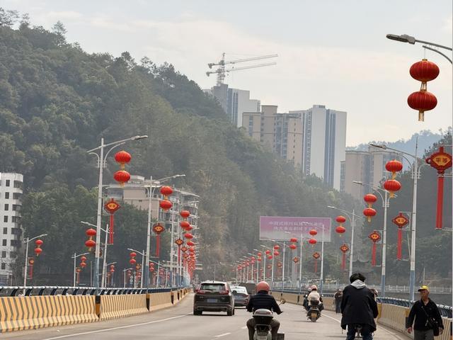 也在各主次干道悬挂上大红灯笼。