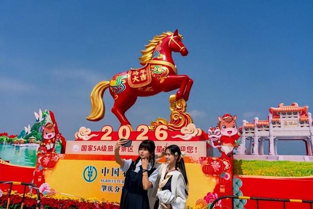 市民在牌坊广场与马年组景合影留念。肇庆市融媒体中心记者严炯明摄