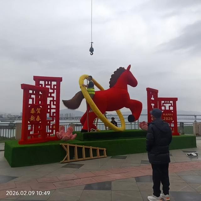 园林工人在高要区明珠广场安装马年景观造型。图源高要区住建局(城管局)