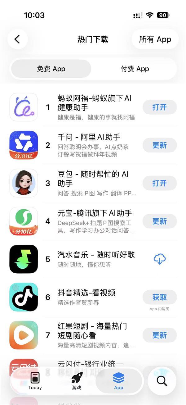 今日,苹果AppStore中国区免费应用榜显示,蚂蚁阿福升至第一,超过千问。