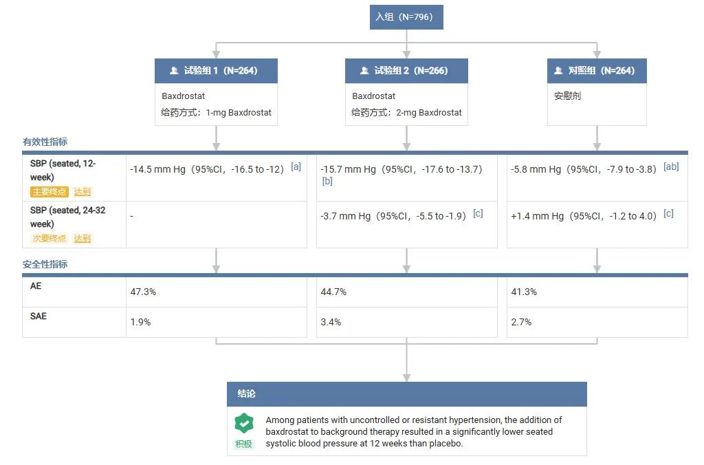 在治疗第12周时,Baxdrostat2mg剂量组平均坐位收缩压较基线的绝对降幅为15.7mmHg,经安慰剂校正后的降幅为9.8mmHg。