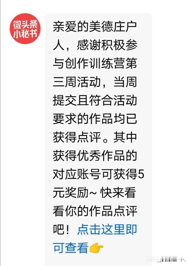 我今天很高兴,我参加的微头条小秘书创作训练营第三周活动,今天得到了收获,分享今日感悟。按活动要求,一周内发布相同内容的文章或微头条,且≥10篇,可获得10元奖金和1000加油包,选择一篇内容优秀的作品交给后台点评,点评成功可再奖励5元。 本次活动,我一共写了11篇短文,超额完成了任务,推荐了一篇获得点评,结果为优秀。 目前10元+5元已到账,1000加油包已经送给我了,我为此很高兴,头条也很诚信,说到做到,以后有适合我的话题我会积极响应。 详情见下图。