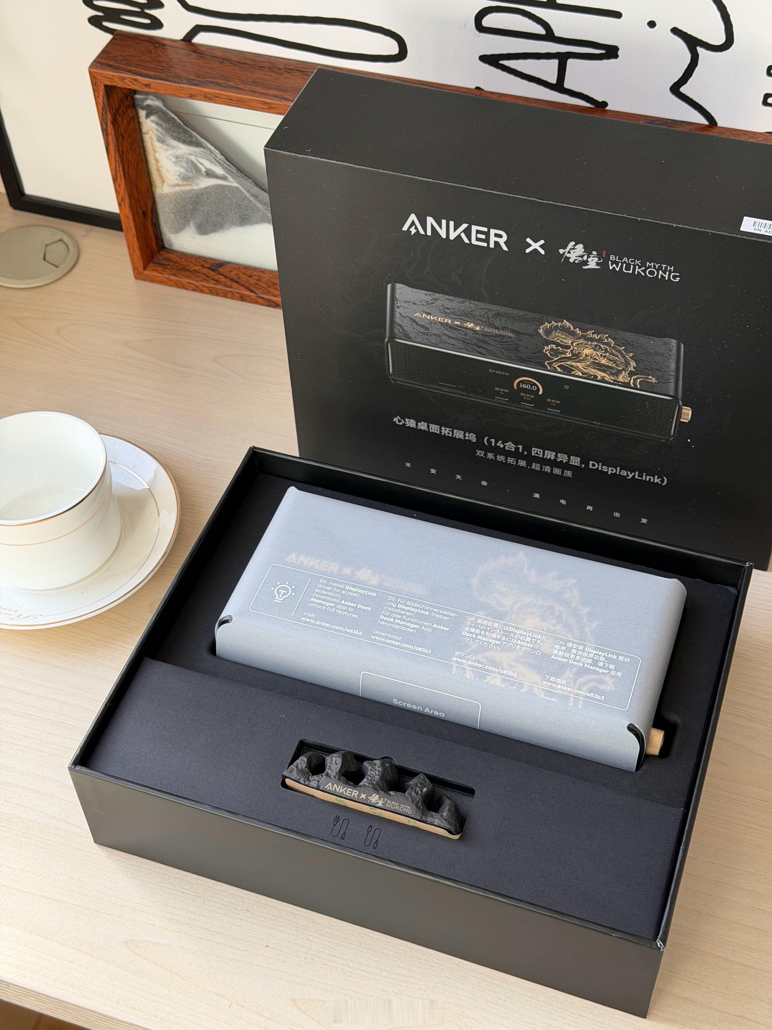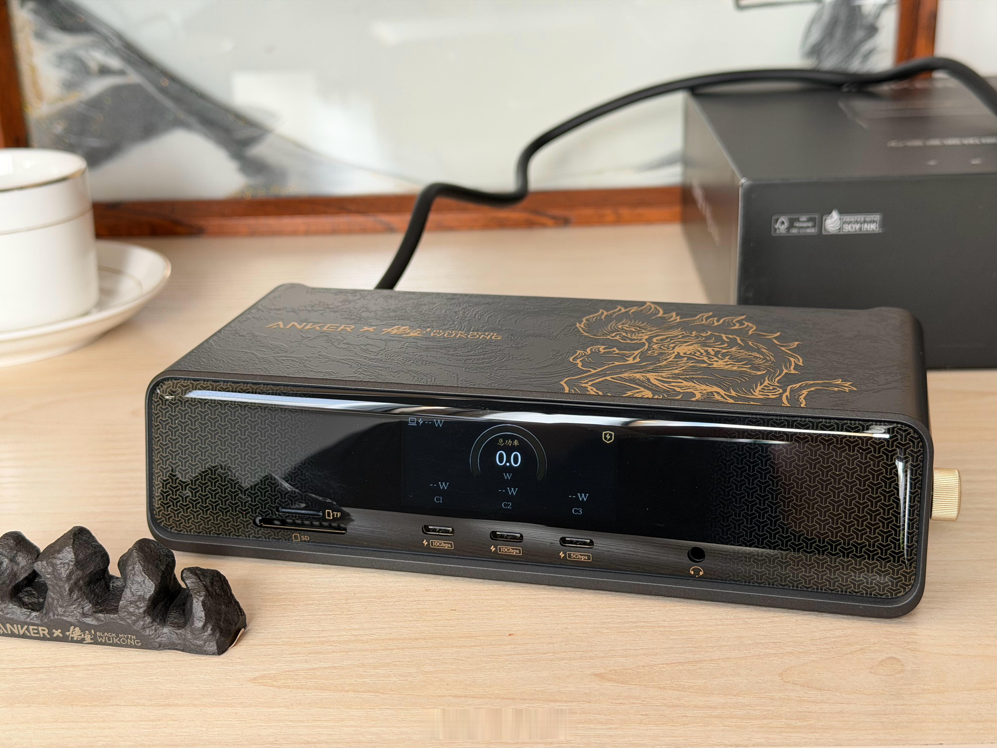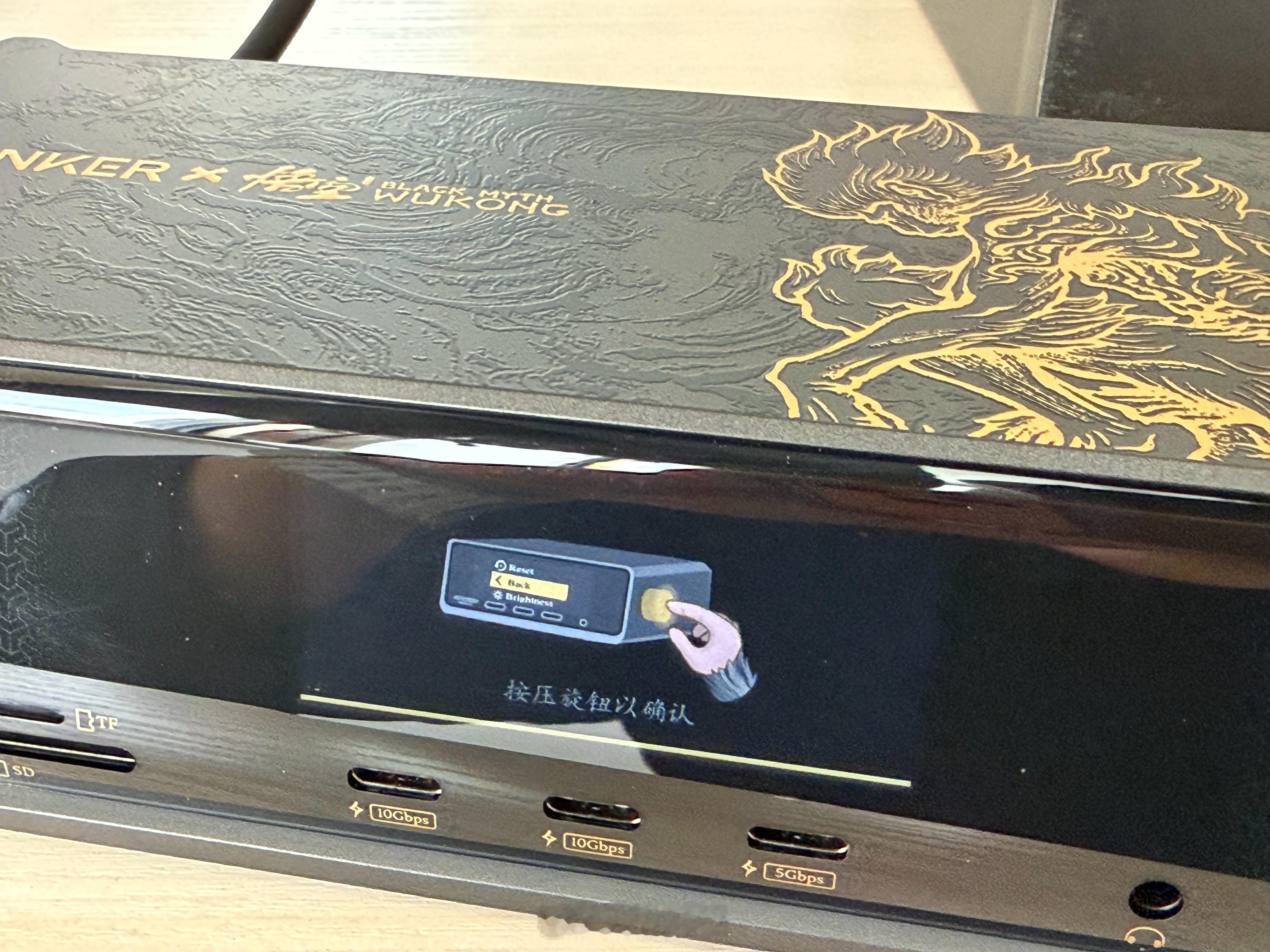 打算过年假期在家玩黑神话悟空的朋友,我替你体验了这套ANKER安克和黑神话悟空联名款的【14合一心猿桌面拓展坞8K四屏异显】,真的是太帅了,满满的黑悟空国潮元素:“黑金”主色调,2.5D浮雕工艺,将《黑神话:悟空》中“心猿”形象立体化呈现。这算是我用过最高端的扩展坞了,有一块能显示当前状态和功率的屏幕,右侧一个金色旋钮,模具凹刻的闪电图案叠加金属漆,转动时“咔哒”声清脆,细节很精致!有点东西