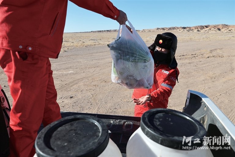 2月7日,吉兰泰采油作业项目部为于怀文送来水和蔬菜,这里的日常生活物资均由40公里外的项目部定期配送。