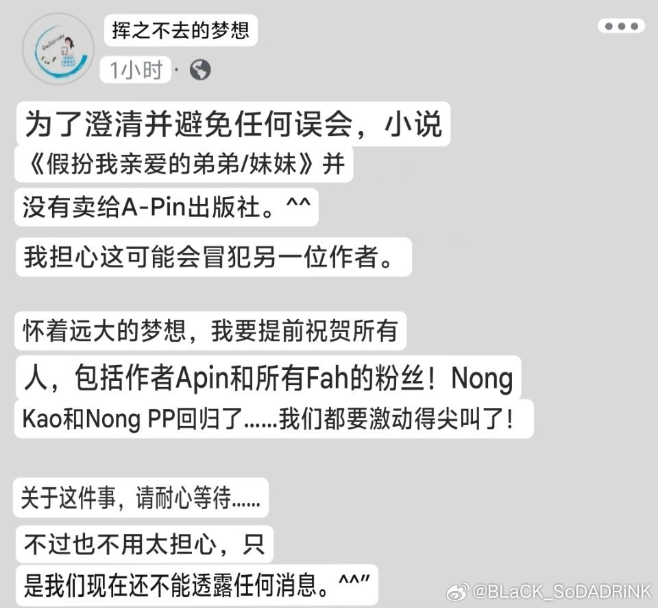 作者可爱捏!因为最近关于他俩要演这部小说都上新闻了,小说也售罄了!“吓得”小说作者出来澄清pin姨没有买这本小说,怕另一位被买了小说版权的作者不高兴,但她也替班法开心,看到俩人要二搭她也超级激动!