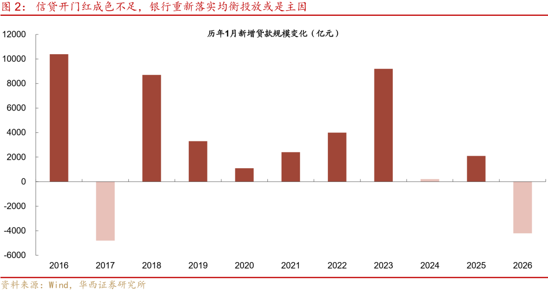 二是信贷开门红成色不足,银行重新落实均衡投放或是主因。1月作为重要的信贷开门红节点,银行内部往往会参考过去一年同期的投放表现,制定相应的增长目标,因而放眼历史,1月新增贷款规模普遍呈现同比多增状态,罕有不增、少增情形,近十年间仅有2017、2024年两个特殊案例。此外,1月新增表内票据融资规模为-8739亿元,同比大幅少增3590亿元,在贷款表现相对一般的背景下,银行并未如以往一般,通过大额票据贴现完成贷款指标,这一情形也与2024年1月颇为相似。种种线索指向,当前银行或正在践行央行四季度货政报告中重新强调的“引导金融总量合理增长、信贷均衡投放”(上一轮密集提及恰好为2023年三季度至2024年三季度)。