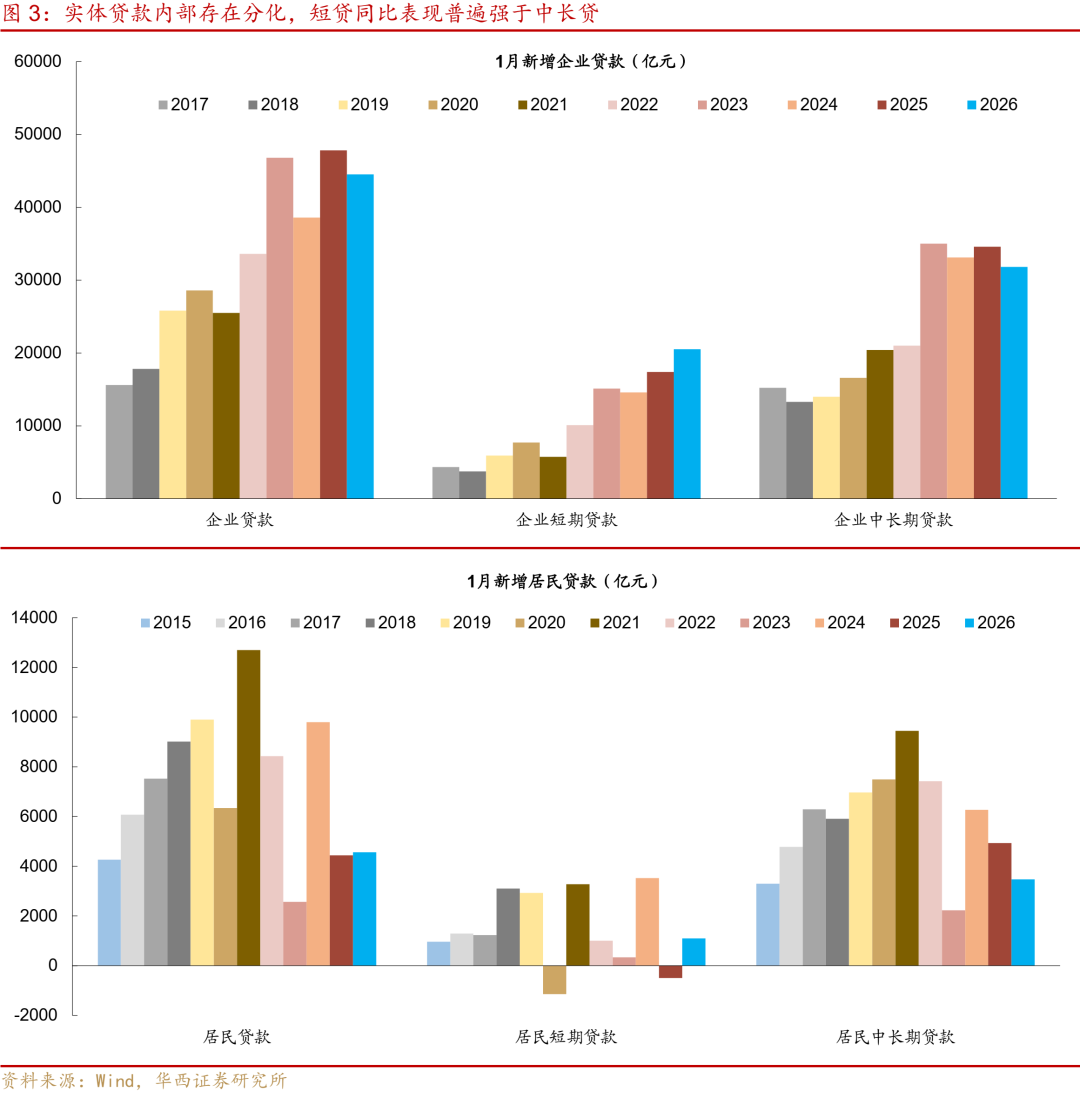 三是实体贷款内部存在分化,短贷同比表现普遍强于中长贷。企业端,1月新增短贷、中长贷分别20500、31800亿元,其中短贷同比多增3100亿元,中长贷同比少增2800亿元;短贷需求可能来自春节前企业融资发放奖金、补贴等福利,同时也不排除部分银行通过企业短贷小范围冲量的可能性;中长贷的需求变化或部分受到企业债发行的挤占效果,但同比少增结果大概率指向企业对未来扩张仍维持谨慎态度。居民端,1月新增短贷、中长贷1097、3469亿元,短贷同比多增1594亿元,中长贷同比少增1466亿元。新一轮国补资金落位,叠加消费贷贴息政策改良,或对居民短期需求起到一定提振作用。但居民中长期加杠杆意愿仍然不强,对应至地产端,1月70大中城市中,一、二、三线城市二手房价仍维持环比下跌状态,跌幅在0.5-0.6%区间。