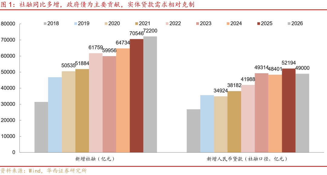 一是社融同比多增,政府债为主要贡献,实体贷款需求相对克制。社融分项中,政府债、未贴现票据、企业债是三大拉动变量,新增规模分别为9764、6293、5033亿元,同比多增2831、1639、579亿元;实体口径新增贷款规模为49000亿元,同比少增3194亿元,为新增社融的主要同比拖累。观察1-2月政府债供给情况,2026年财政大概率维持2025年靠前发力节奏,“政府加杠杆”或是新增社融的重要来源。不过从同比视角来看,2025年2月为政府债密集供给期,净发行规模达到1.69万亿元,社融数据或面临政府债同比高基数的挑战。