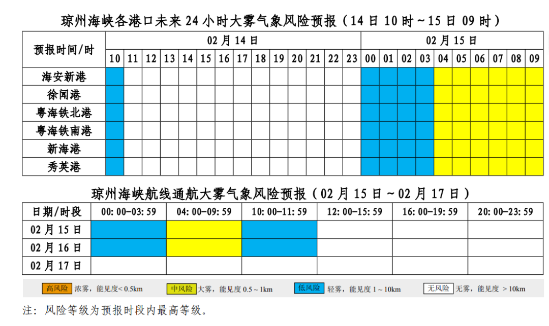 今天夜间至15日早晨,北部湾北部海域、琼州海峡、雷州半岛附近海域、广东沿海海域、台湾海峡有能见度不足1公里的大雾,部分时段能见度不足500米的浓雾。