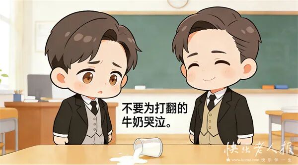 后来,卡耐基前去拜访中学时的老师,听完他的叙述,老师没有多说什么,只是将手边的牛奶打翻,说道:“不要为打翻的牛奶哭泣。”老师简单的一句话令卡耐基如梦初醒。“是的,牛奶被打翻了,全部洒了,该怎么办?是看着被打翻的牛奶哭泣,还是转身去做些有意义的事?记住,被打翻的牛奶已成事实,不可能被重新装回瓶中,我们唯一能做的,就是吸取教训,然后忘掉这些不愉快。”这段话,卡耐基后来不仅常常讲给学生听,也用来提醒自己。
