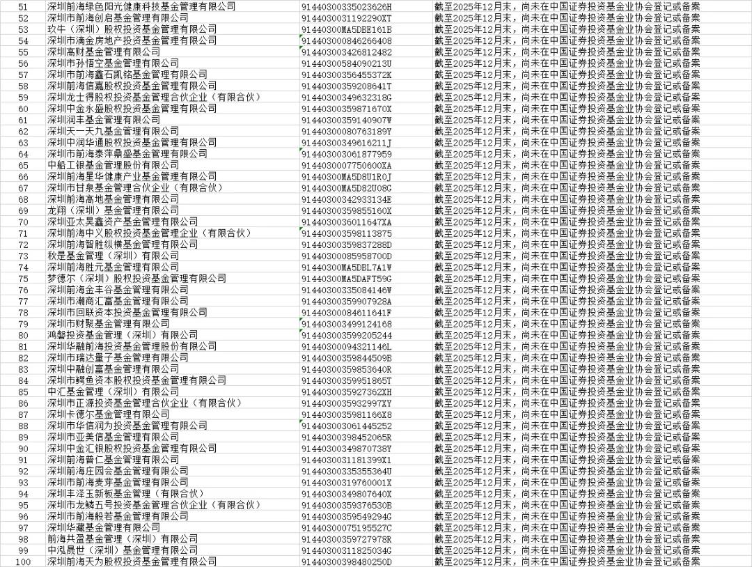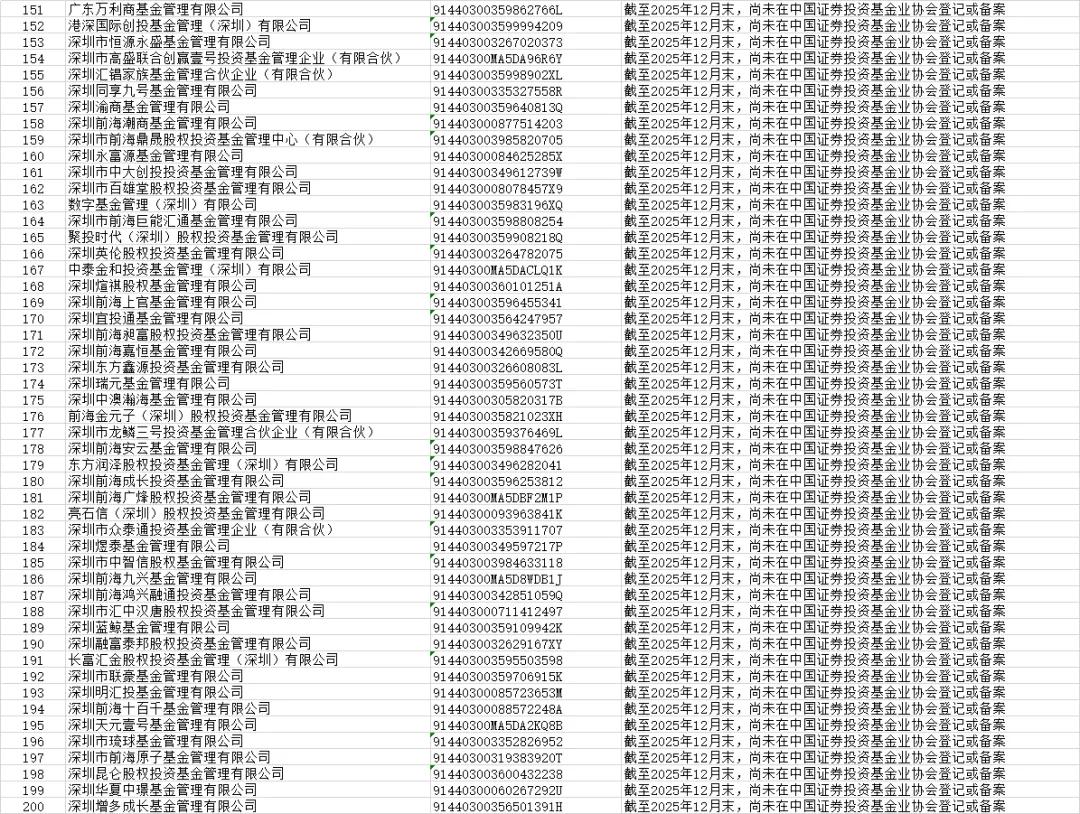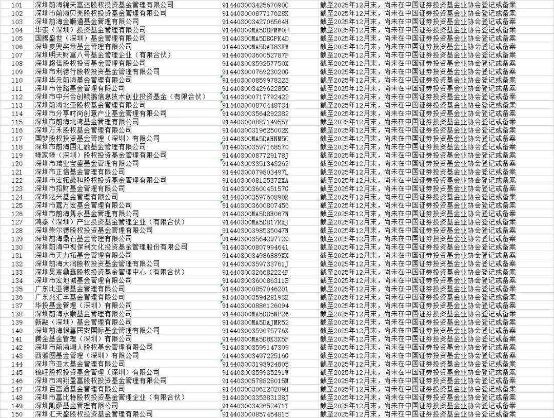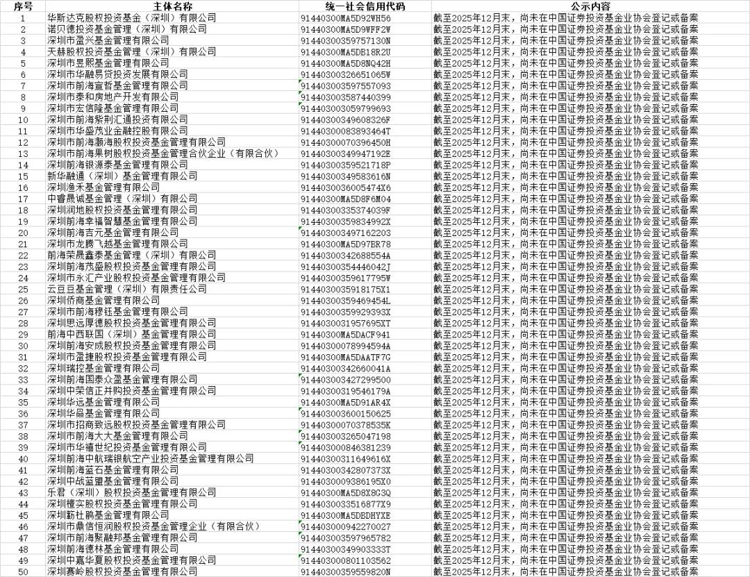 本次公示的机构为注册地在深圳,名称或经营范围含“证券”“证券投资咨询”“基金管理”“私募”等涉金融字样,但未取得中国证监会核发的经营证券期货业务许可证或未按规定登记备案的机构。