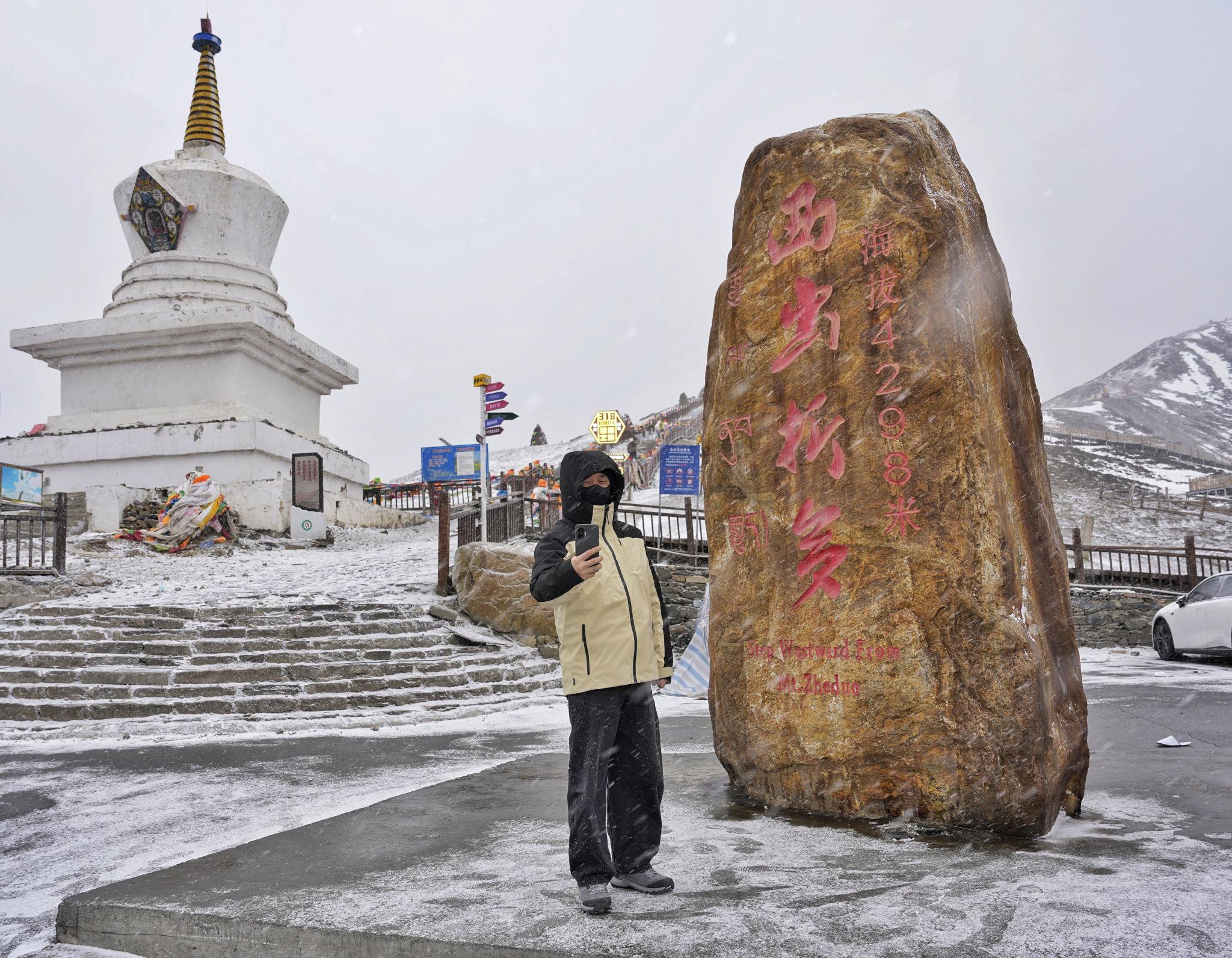 1月30日,游客正在折多山垭口处“西出折多”碑前打卡拍照。新华社记者刘坤摄