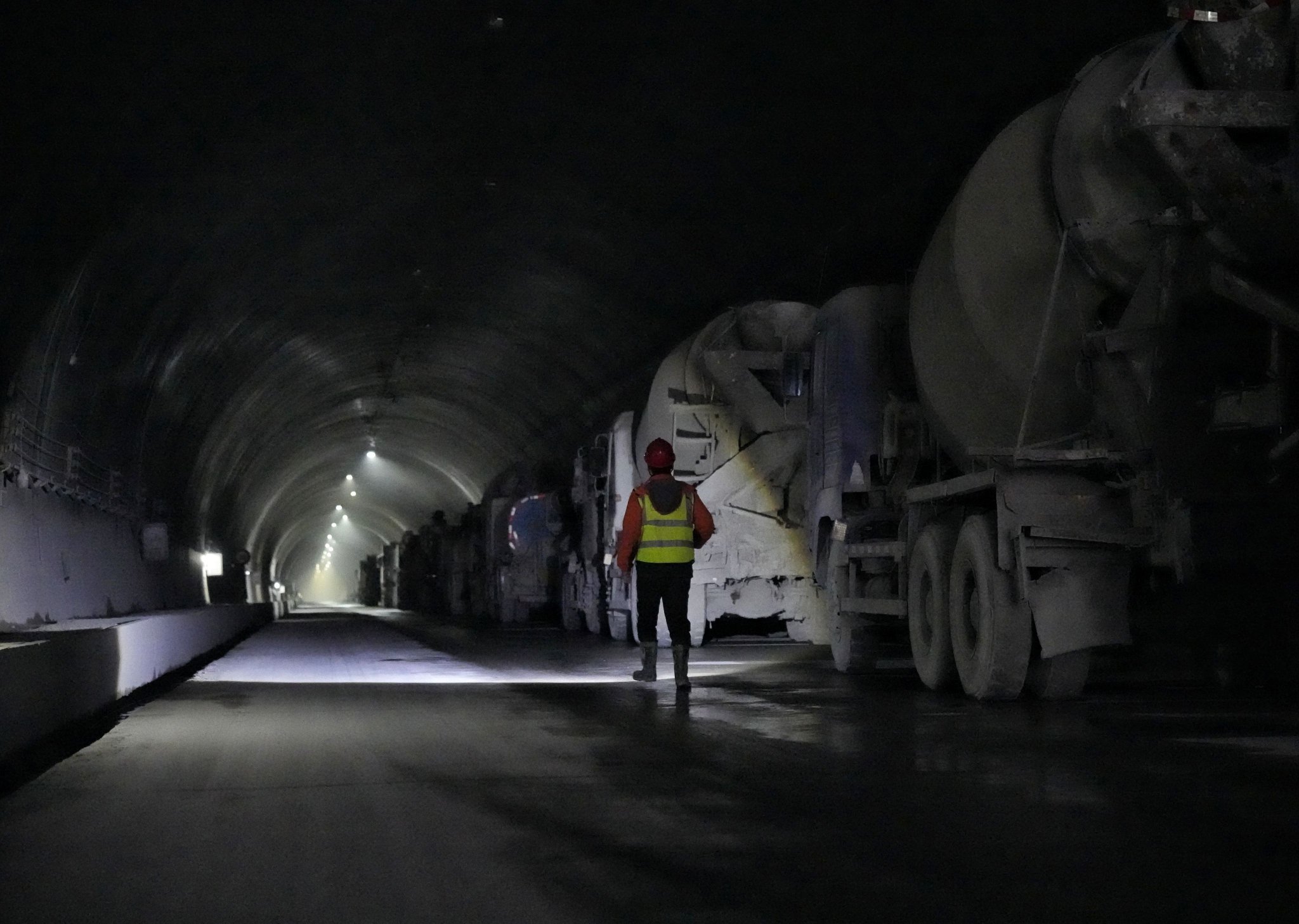 工人们在折多山隧道内巡查。新华社记者刘坤摄