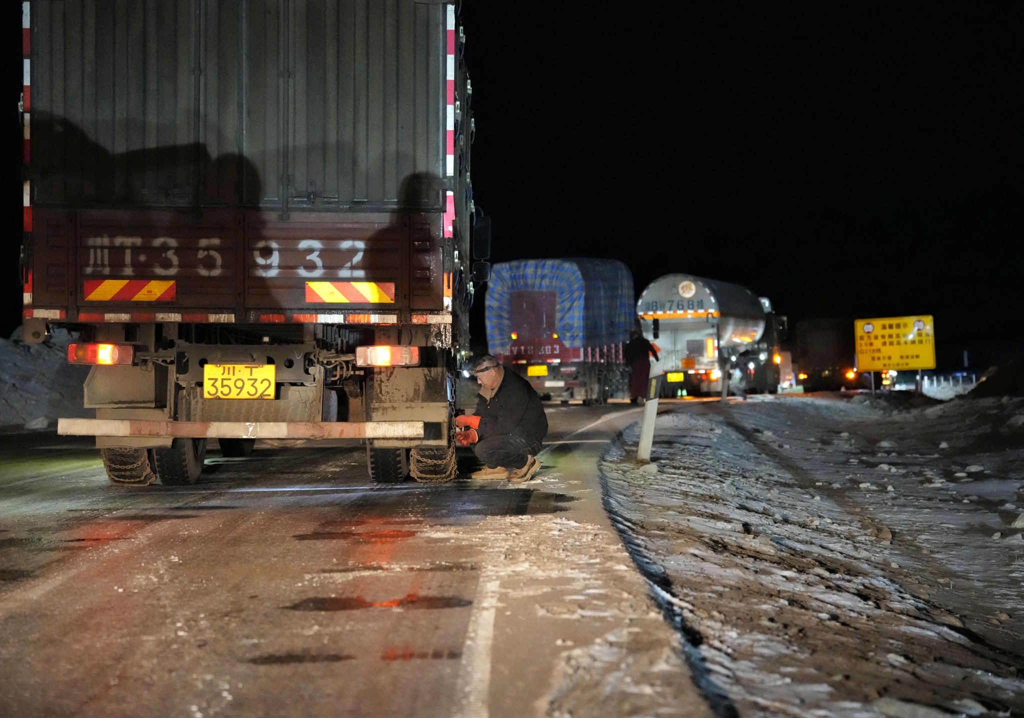 1月30日晚,折多山雪夜中,司机们纷纷停车安装防滑链。新华社记者刘坤摄