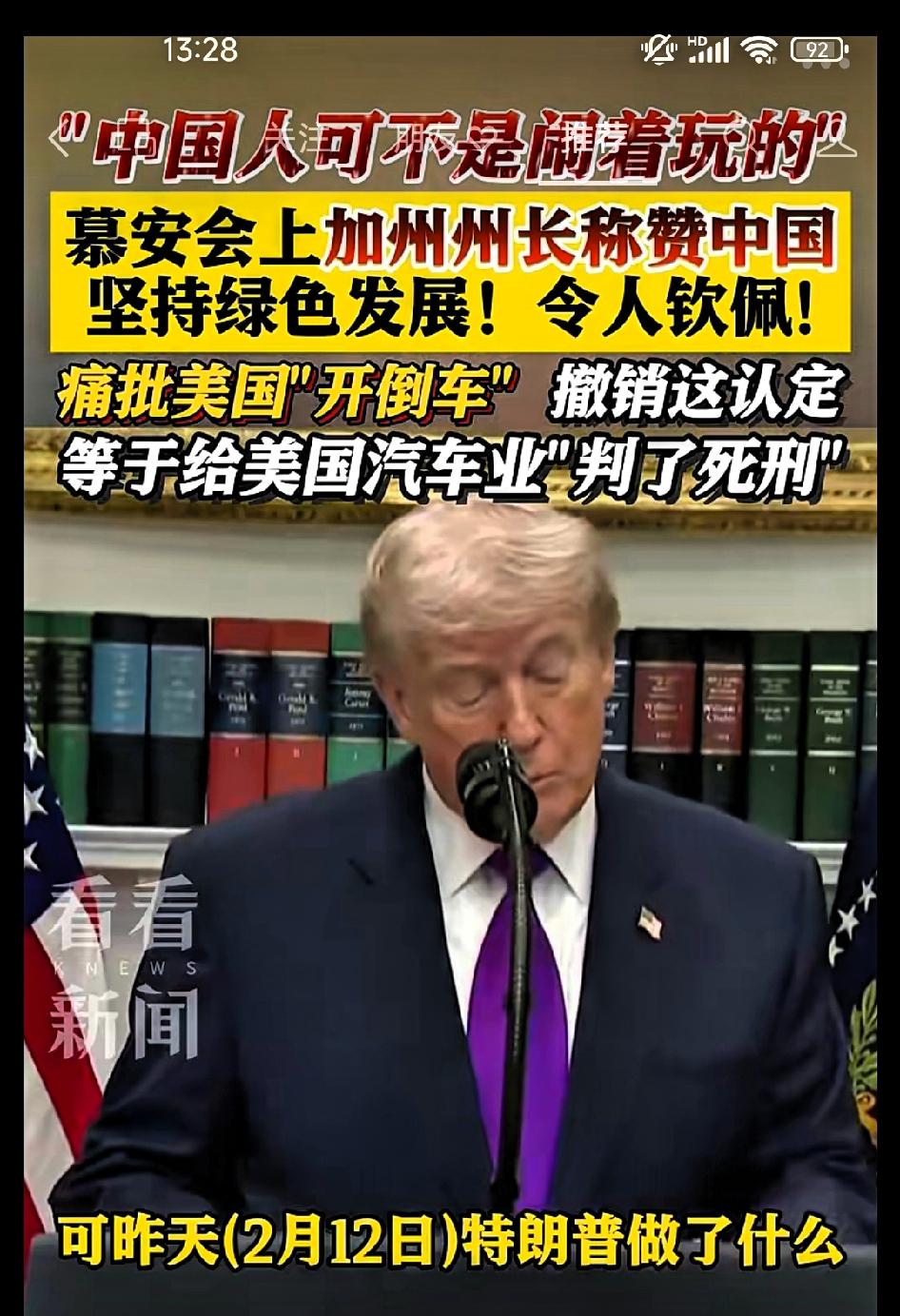 慕安会上加州州长纽森称赞中国:“绿色低碳”他们可不是闹着玩的! 全球70%的电动汽车来自中国,我是怀着敬佩之情说这些的。2月12日,特朗普开历史倒车,他撤销了“气候变化危害认定”。我认为这是在给美国传统汽车制造商的未来发展判死刑。 编者按:他用中国的例子证明,发展与减排可以兼得,这其实也是在给美国自己的政策找参照。 事实也确实硬气:中国风电、光伏装机容量已连续十年全球第一,去年可再生能源装机规模历史性超过火电,提前六年完成了目标。新能源汽车就更厉害了,去年1-11月,产销量占全球总量的65% 以上。 作为美国人能这么客观评价,既是尊重事实,也透着一股急切——在气候变化这个“地球村”难题面前,再大的政治分歧也可以先放一放。毕竟山火、干旱不会挑阵营,环境是所有人的饭碗。这种技术不藏私、经验可分享的态度,才是人类能一起走下去的基础。希望这种务实的声音能多一些,地球这艘大船,需要所有国家当好“好邻居”。
