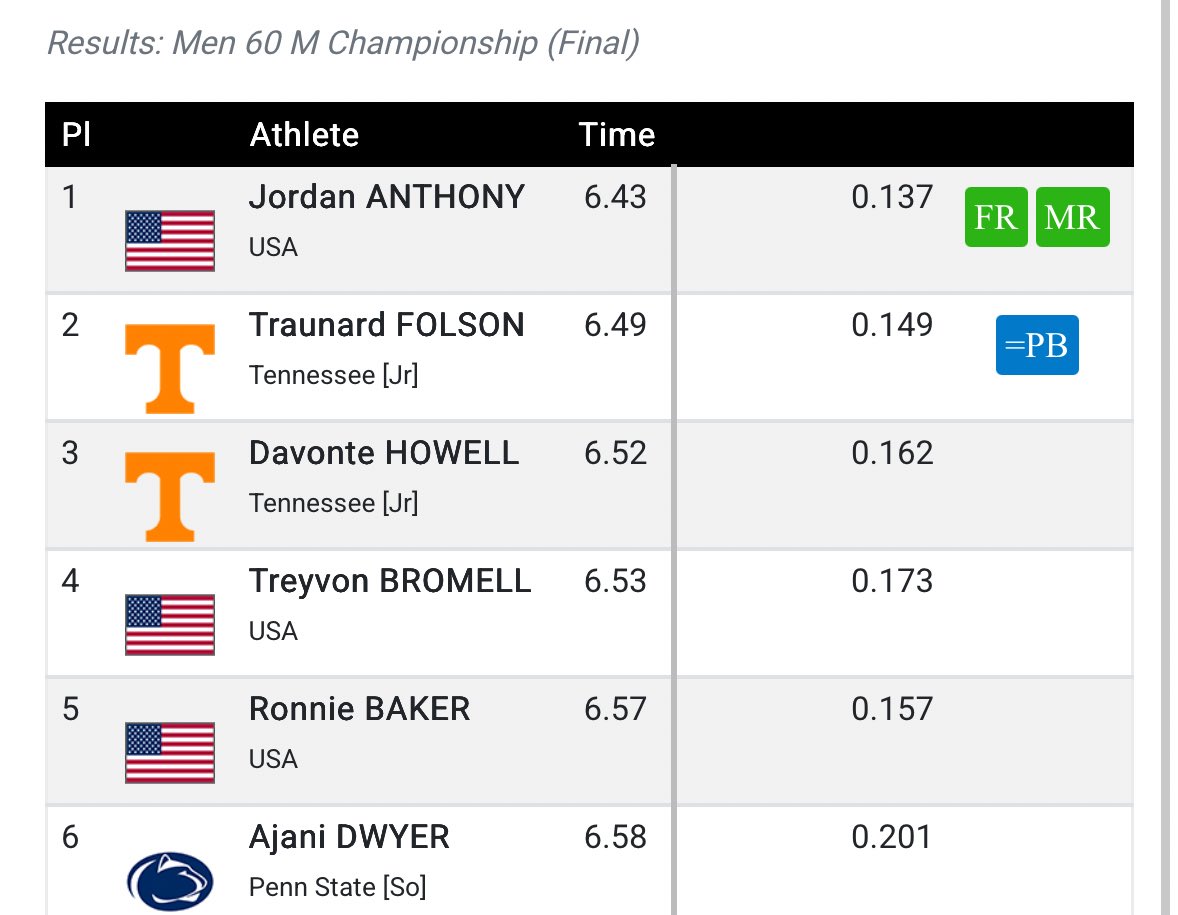 跻身历史前10!泰森邀请赛男子60米:安东尼6秒43刷新PB&WL