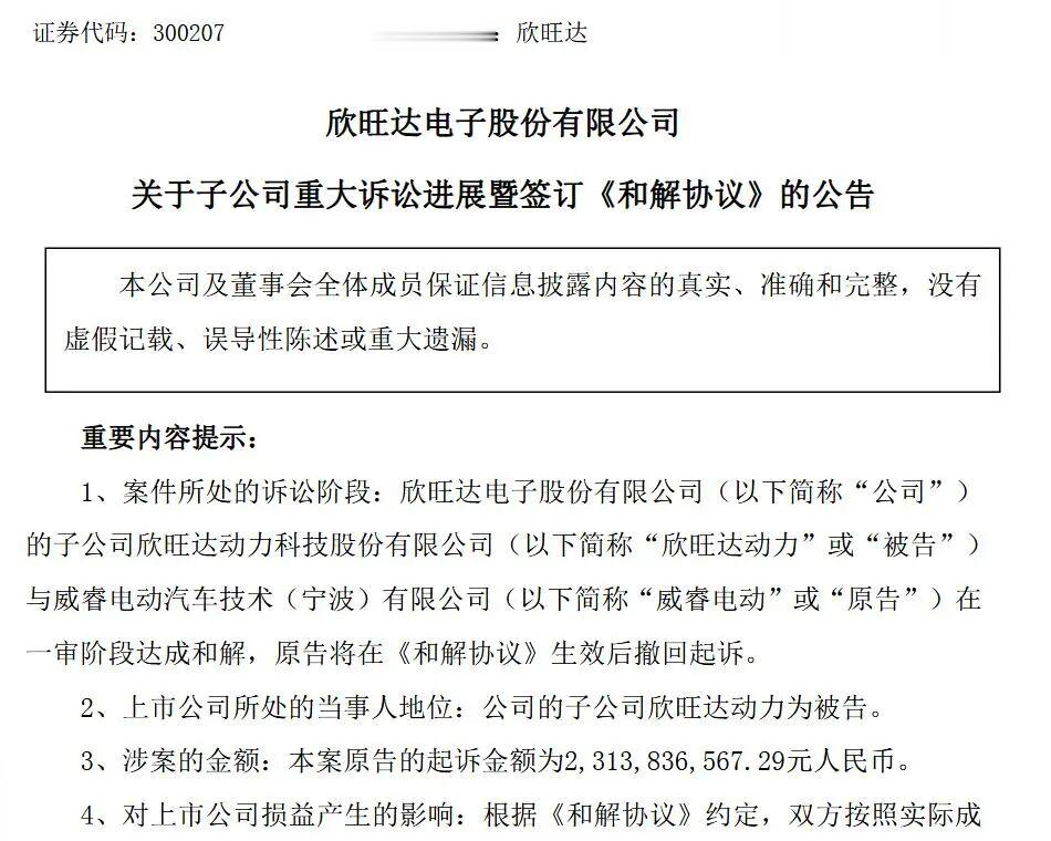 2月6日,欣旺达发布公告称,其子公司欣旺达动力已与吉利控股集团旗下的威睿电动汽车技术有限公司达成和解。