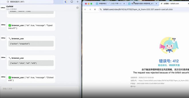 CoPaw操作方式也会触发B站的风控机制,它的解决方式是自动等待风控解除,最终顺利播放。