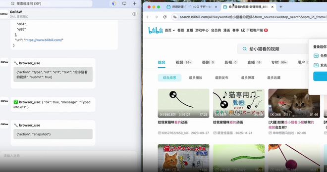 用户也可以指挥CoPaw在B站搜索某个视频,并在电脑屏幕上播放视频。可以看到,CoPaw在执行任务时,需要进行截图等操作,以理解屏幕内容。