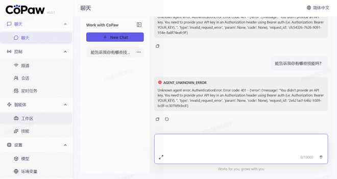 目前,CoPaw可以在云端和本地部署。部署后,用户需要配置大模型API,也就是给CoPaw接一个外挂的大脑,才可以进行对话,否则CoPaw就会直接报错。