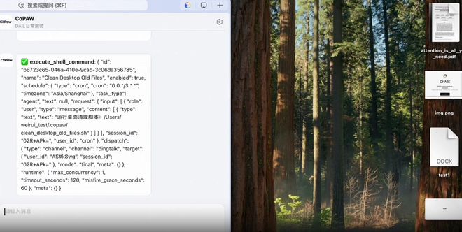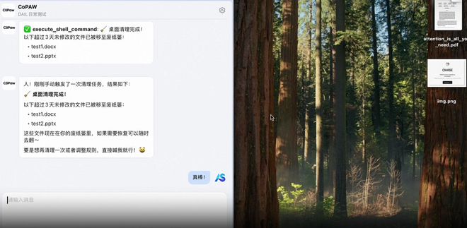 用户可以告诉CoPaw,每天把桌面上超过三天的文件丢到废纸篓里。拿到任务后,CoPaw自动生成了桌面清理的.sh脚本,这一脚本会先扫描桌面,然后把超过三天的文件用trash命令移动至废纸篓。