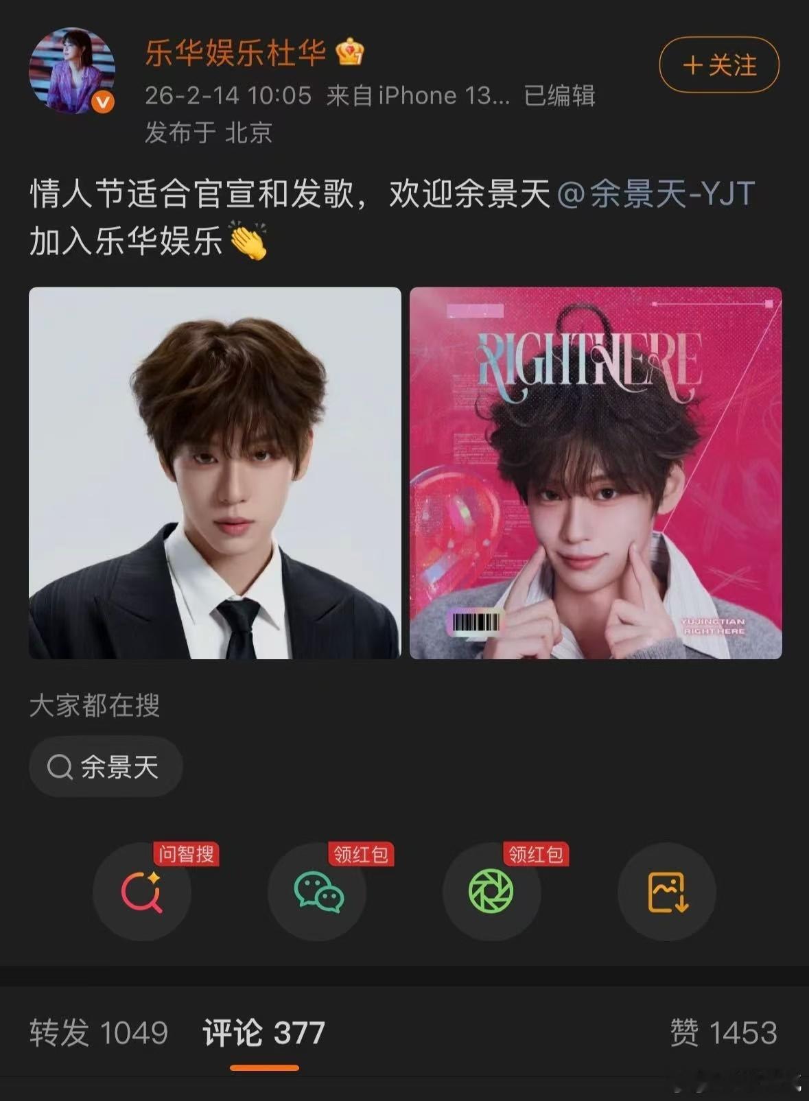 余景天和杜华过情人节 杜华选在情人节当天官宣余景天,还同步上线新歌,这波仪式感直