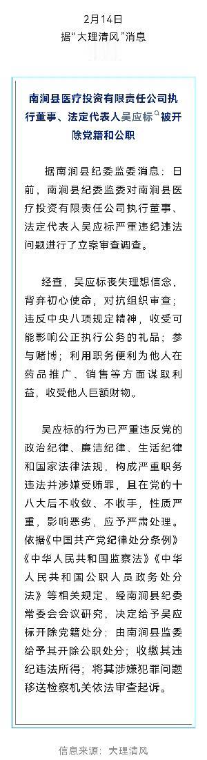 刚刚通报!大理南涧县一医疗公司法人被“双开”! 2月14日,“大理清风”发布消息如下: 南涧县医疗投资有限责任公司执行董事、法定代表人吴应标被开除党籍和公职。 据南涧县纪委监委消息,日前,南涧县纪委监委对南涧县医疗投资有限责任公司执行董事、法定代表人吴应标严重违纪违法问题立案审查调查。 经查,吴应标丧失理想信念,背离初心使命,对抗组织审查;违反中央八项规定精神,收受可能影响公正执行公务的礼品;参与赌博;利用职务之便为他人在药品推广、销售等方面谋取利益,收受他人巨额财物。