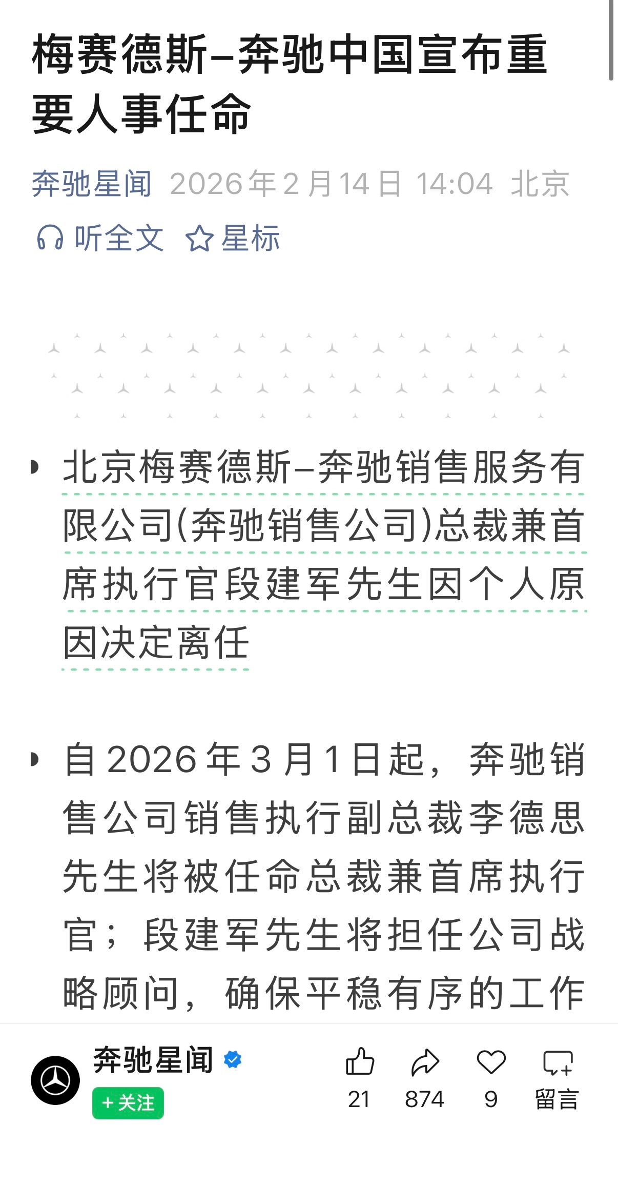 自2026年3月1日起,奔驰销售公司销售执行副总裁李德思先生将被任命总裁兼首席执行官;段建军先生将担任公司战略顾问,确保平稳有序的工作交接,直至4月30日任期届满。
