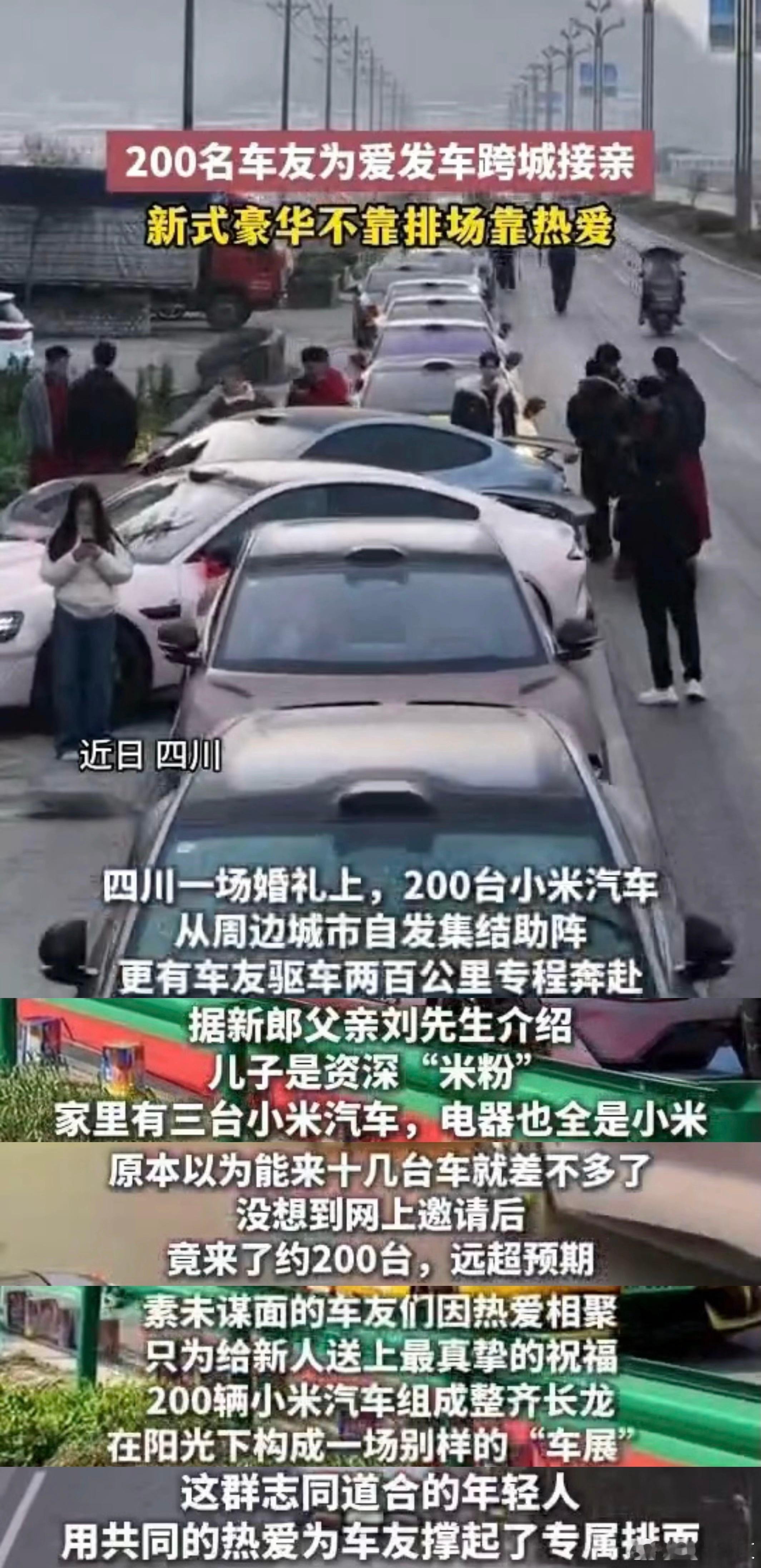 接亲路上,路人拍照、新人招手、车友鸣笛致意。有人说这排面不输传统豪华车队,但真正打动人心的,是200个素不相识的人,因为同一份热爱,愿意为另一对陌生人的幸福跑一趟。
