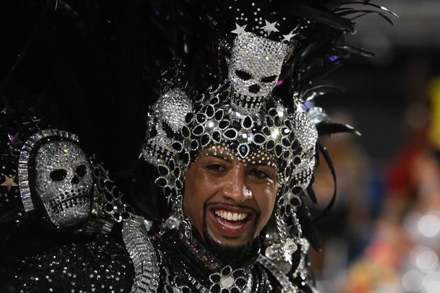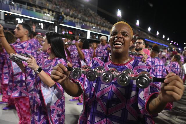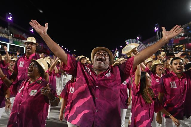 2月13日,一家桑巴学校的成员参加在巴西里约热内卢举行的2026年狂欢节游行。新华社发(卢西奥·塔沃拉摄)