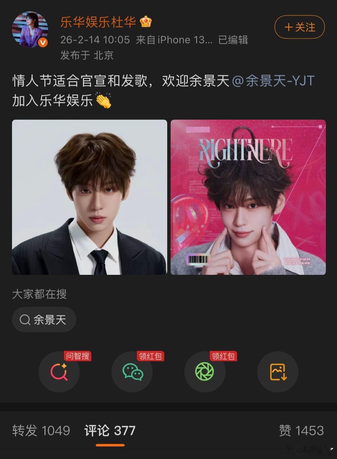 余景天和杜华过情人节别人过情人节搞事业,杜华在情人节这天官宣余景天加入乐华娱乐新
