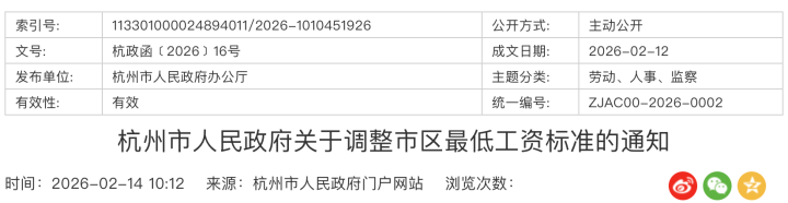 2月14日,杭州市委市政府网站发布《杭州市人民政府关于调整市区最低工资标准的通知》。