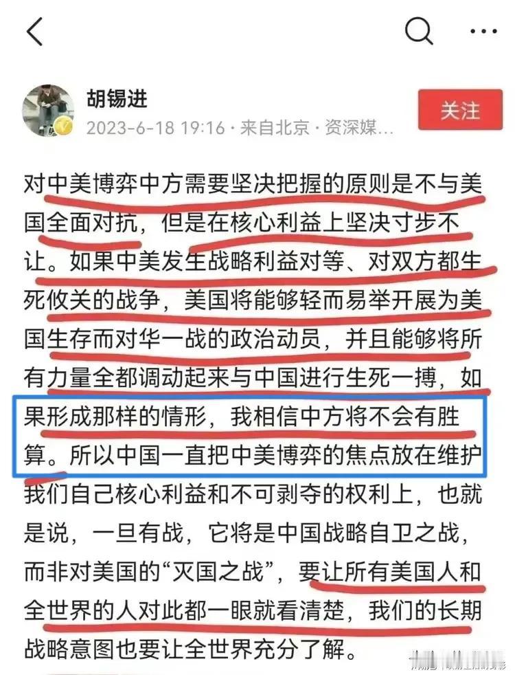 胡锡进的崇美崇日是一贯的,在2023年9月老胡说过“我们决不能把自己朝着美国敌人的方向去打造,也不能把美国和它的盟友朝着中国敌人的方向去推动”。 可见不管美国对我们怎么样,胡锡进都坚持认为对方不是我们的敌人。又因为日本是美国的盟友,所以不管日本对我们怎么样,胡锡进也都坚持认为日本不是我们的敌人。 为什么胡锡进如此坚持“别人虐我千百遍,我待别人如初恋”呢?原来2023年6月胡锡进就说道“如果中美发生战争……我相信中方将不会有胜算”。可见老胡认为我们打不过美国,既然打不过,就只好忍气吞声,既不能与美国对抗,也不能与日本对抗。 可是胡锡进是什么人呢?老胡曾经担任多年的环球时报总编,是我们宣传战线的一员干将。堂堂一个胡总编,竟然公开宣扬“中方没有胜算”,这是何等的软骨头,未战先怯准备率先当逃兵了吗? 那么胡锡进的笔杆子不能化作一把挥向美日的大刀,反而沦为亲善美日的投名状,老胡的意志为何如此软弱呢?