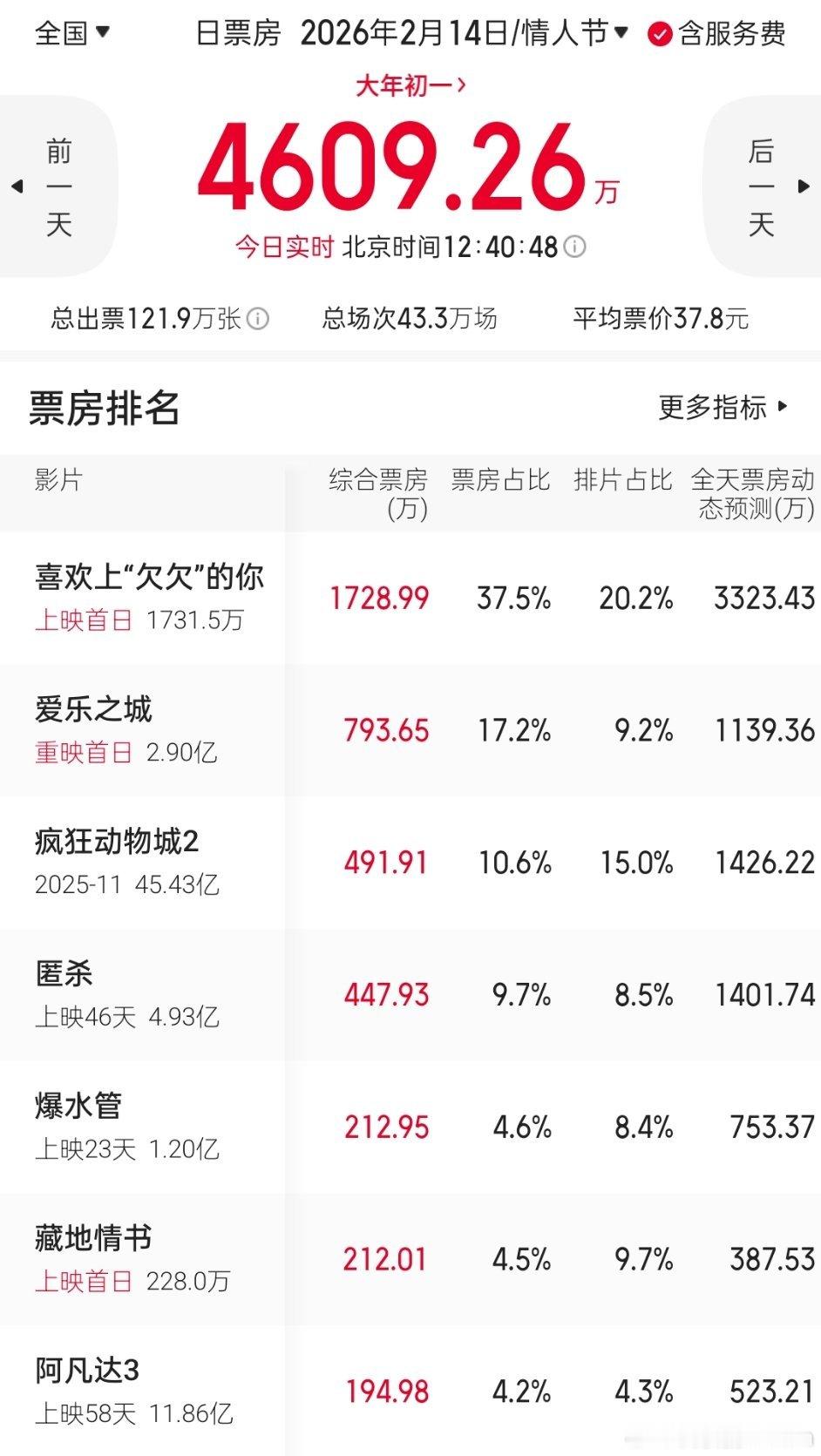 看电影的快乐正全面升级🔻这是情人节的电影票房,今天会有很多情侣去看电影,目前数据是0.46亿票房,数据还行吧....