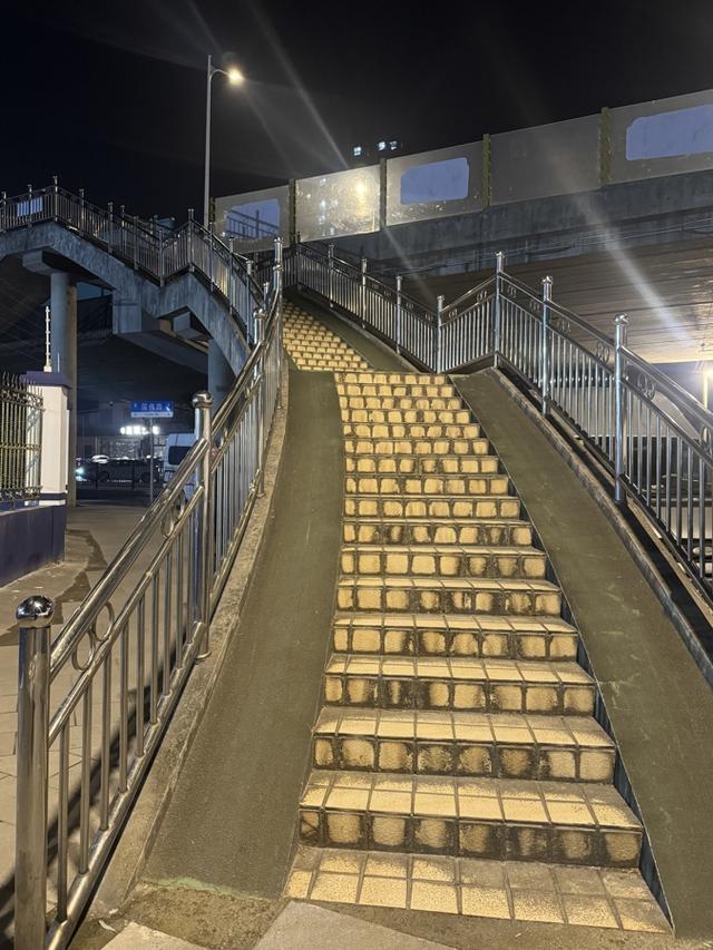 现场记者还看到,有市民推行电动自行车使用坡道想从国伟路的南测西向东行,上坡极为吃力,一度出现车辆后滑险情,十分危险。“这个坡道最多只能拉个小拉车,轮椅根本上不去,腿脚不好的老人也只能一级一级慢慢挪。”一位路过的市民吐槽,天桥的坡道又陡又窄,给行动困难人群的通行造成了极大障碍。家住附近的八旬老人李阿婆告诉记者,她每次经过这座天桥都需家人陪伴,“走几级就要歇一歇,扶手又够不着,心里直发慌。”老人直言,这么高的天桥,应该加装无障碍电梯,不仅提供无障碍通行便利,也能保障安全。