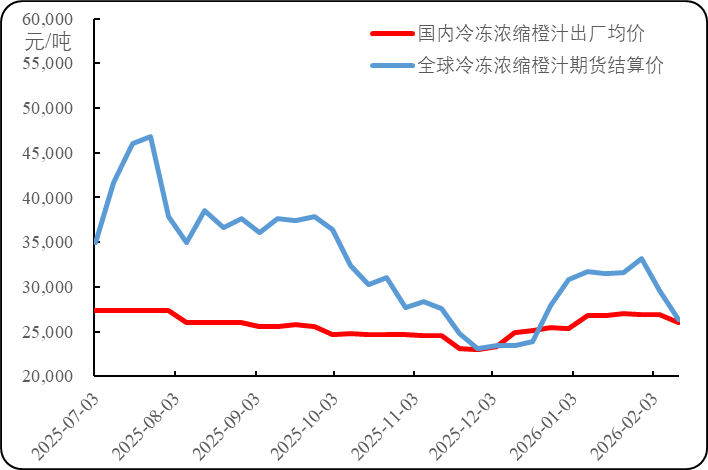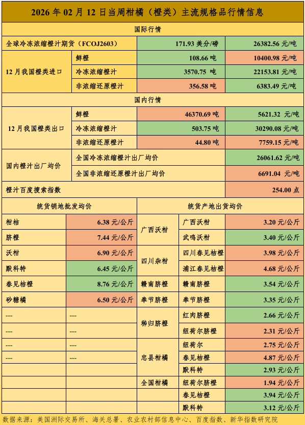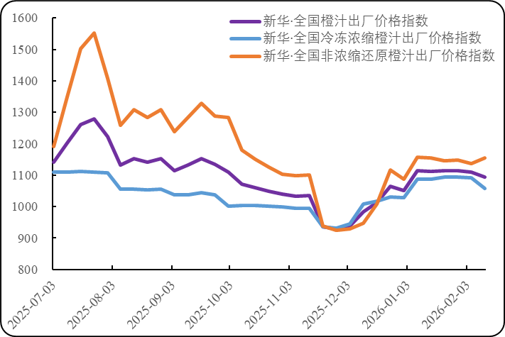 新华财经北京2月14日电(张保贺)欧盟鲜食甜橙减产且价格高企或将使得低价的橙汁消费增量,中国传统春节假期临近带动终端市场鲜橙及橙汁消费增量。春节前夕,物流等交易成本上涨,使得全球冷冻浓缩橙汁价格继续下滑且期现差基本归零,与终端消费直接关联的非浓缩还原橙汁出厂价出现小幅上涨。截至2月12日,当周全球冷冻浓缩橙汁期货合约(FCOJ2603)结算均价为171.93美分/磅(折合26.38元人民币/公斤),环比(2月5日,下同)下跌4.20%;新华·全国冷冻浓缩橙汁出厂价格指数报1056.81点,环比下跌3.15%;新华·全国非浓缩还原橙汁出厂价格指数报1153.73点,环比上涨1.43%;新华·全国橙汁出厂价格指数报1093.98点,环比下跌1.35%。