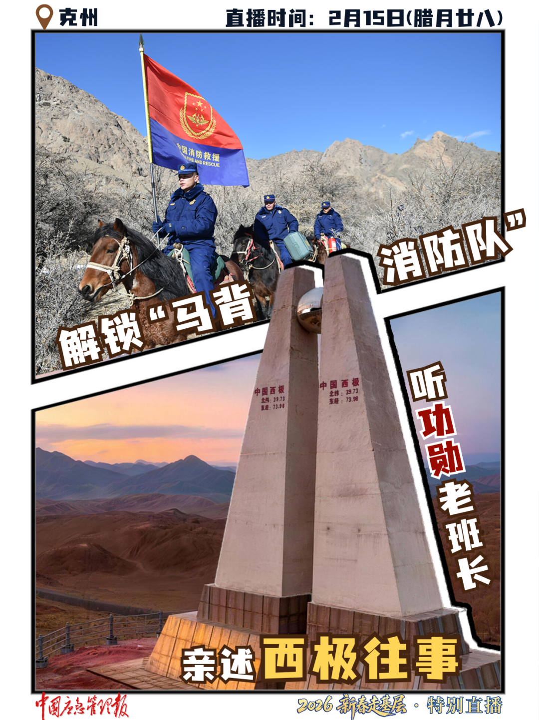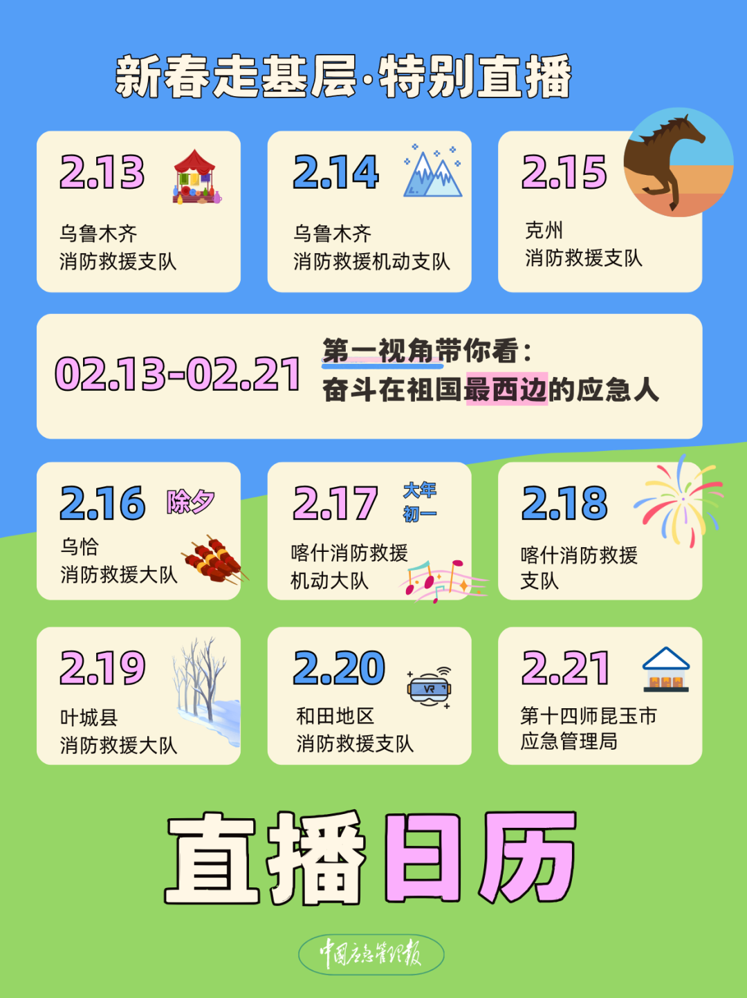2月13日至2月21日(腊月廿六至正月初五),中国应急管理报推出新春走基层·特别直播,与记者胥得意同行,第一视角带你看:奋斗在祖国最西边的应急人,连播9天,一起在直播间过新春