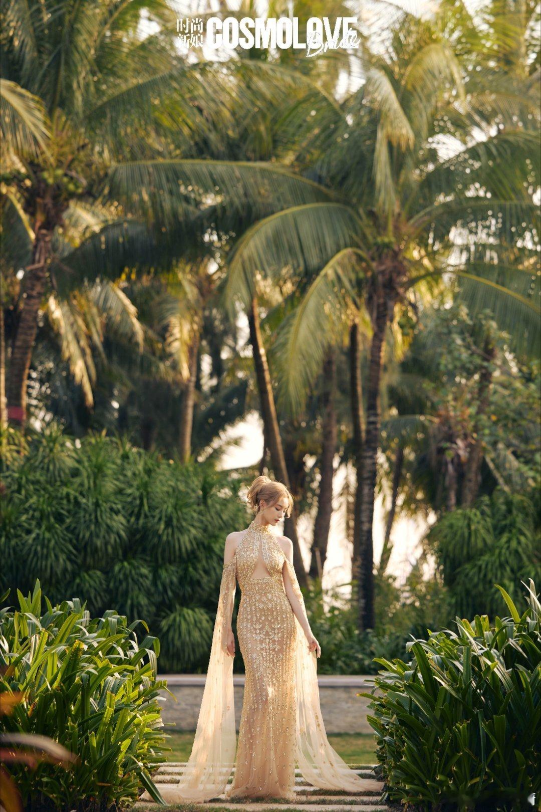 徐艺洋蓝裙缀星钻,似把银河揉进褶皱里,纱袖拂过热带叶影,光与影在裙摆跳圆舞曲,粉