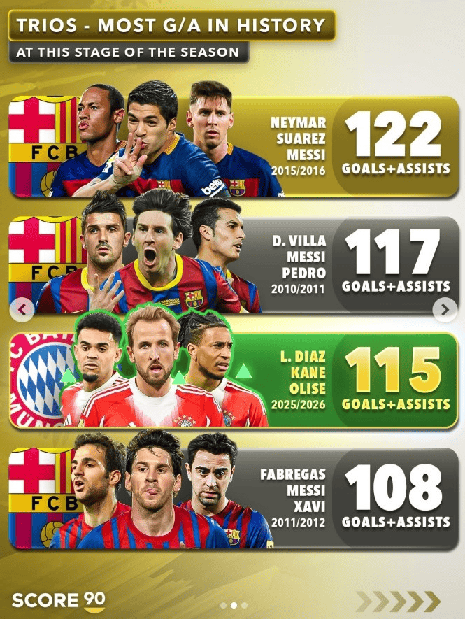 3、2025/26赛季,拜仁(凯恩,奥利塞、迪亚斯)115球