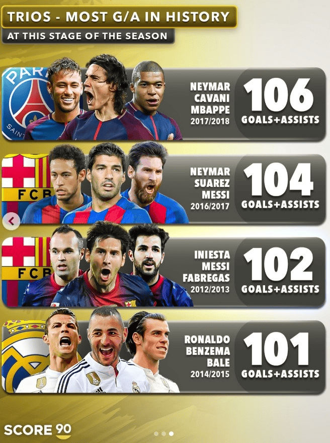 5、2017/18赛季,巴黎(内马尔、姆巴佩、卡瓦尼)106球