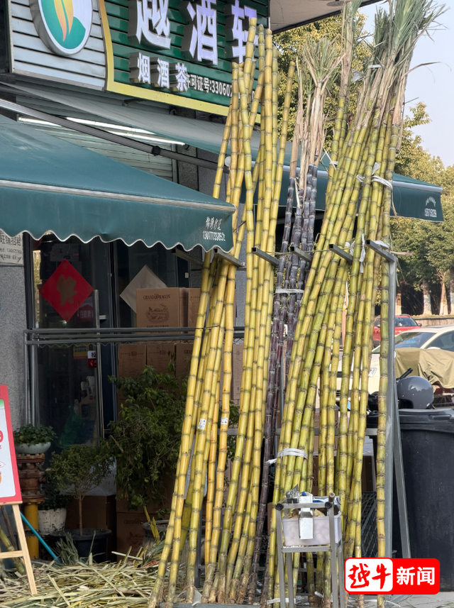在该店门口最显眼的位置,并排摆放着三捆甘蔗。记者观察到,右边是市民最熟悉的青皮甘蔗,粗壮扎实,按根售卖,18元一根。中间是紫皮甘蔗,色泽深红,标价15元一根。